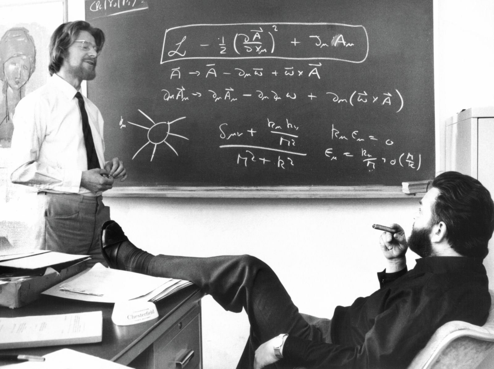 At CERN in 1973, John Bell (left), who was working there at the time, interacts with Martinus Veltman (right), who was then a professor at Utrecht University in the Netherlands. Since early 2020, COVID-19 has hindered physicists’ ability to travel and discuss physics in person. (Courtesy of CERN.)