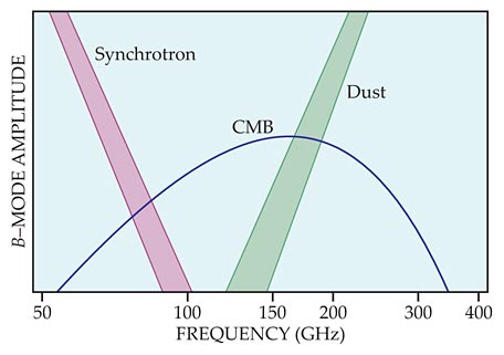 As shown in the figure, though, the CMB and dust contributions to the B-mode maps can be distinguished by their frequency dependences. Whereas the CMB has a blackbody spectrum that peaks near a frequency ν of 160 GHz, the thermal-emission spectrum of dust rises roughly as the power law ν1.6 over the frequencies at which CMB measurements are made. Also, at relatively low frequencies, synchrotron radiation from electrons spiraling in the galactic magnetic field makes a significant contribution to the B modes imprinted on the CMB.