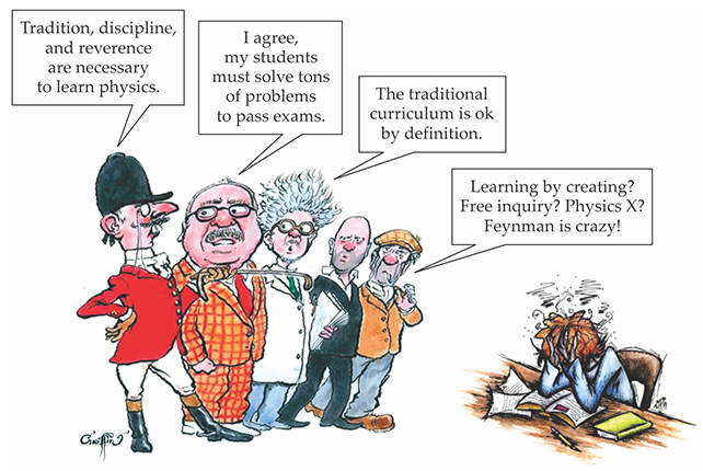 Feynman’s lectures successfully omitted proposed problems. His teaching style is also exemplified in the noncredit, no-homework, no-registration, tuition-free Physics X course he offered at Caltech. Students met weekly, and the curriculum consisted of whatever they felt like discussing. The primary focus was to promote a culture of free inquiry and joy toward the subject. In the lectures I have attended so far at UCL, the idea of enjoying physics has not even been raised.
