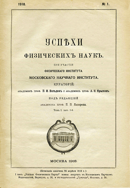Cover page of the first issue of the journal Uspekhi Fizicheskikh Nauk (Advances in Physical Sciences) published on 29 April 1918.