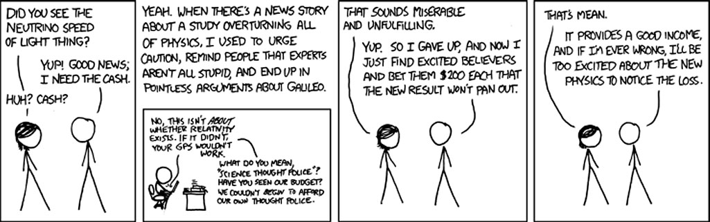 Almost immediately, papers explaining, interpreting, and dismissing the effect began arriving at a rate of several per day on the arXiv preprint server. The smart money (see cartoon, below) says that when the dust settles, OPERA’s claim will have been refuted, notwithstanding the assertion that it is a six-sigma effect.