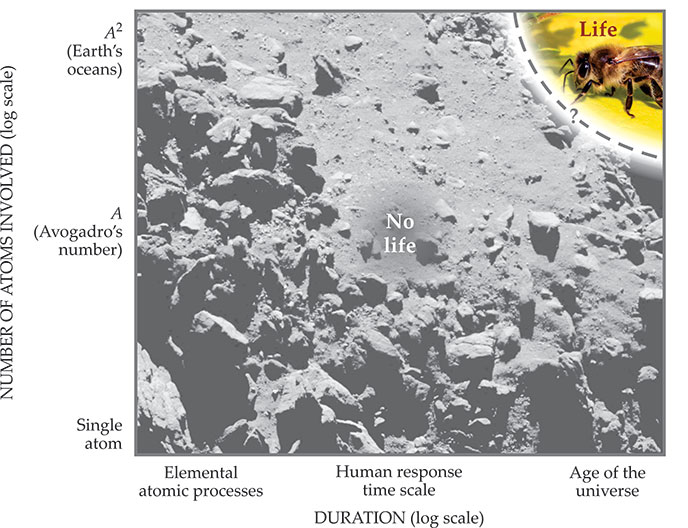 The number of atoms available and the time they have to interact are two of the many variables relevant to the origin of life. Life is not so easily initiated that it readily leaves a signature in meteorites coming from parent bodies exposed to water for millions of years. Hence the suggested but highly uncertain boundary between life and nonlife. This figure is intended to demonstrate our ignorance, not to assert understanding.