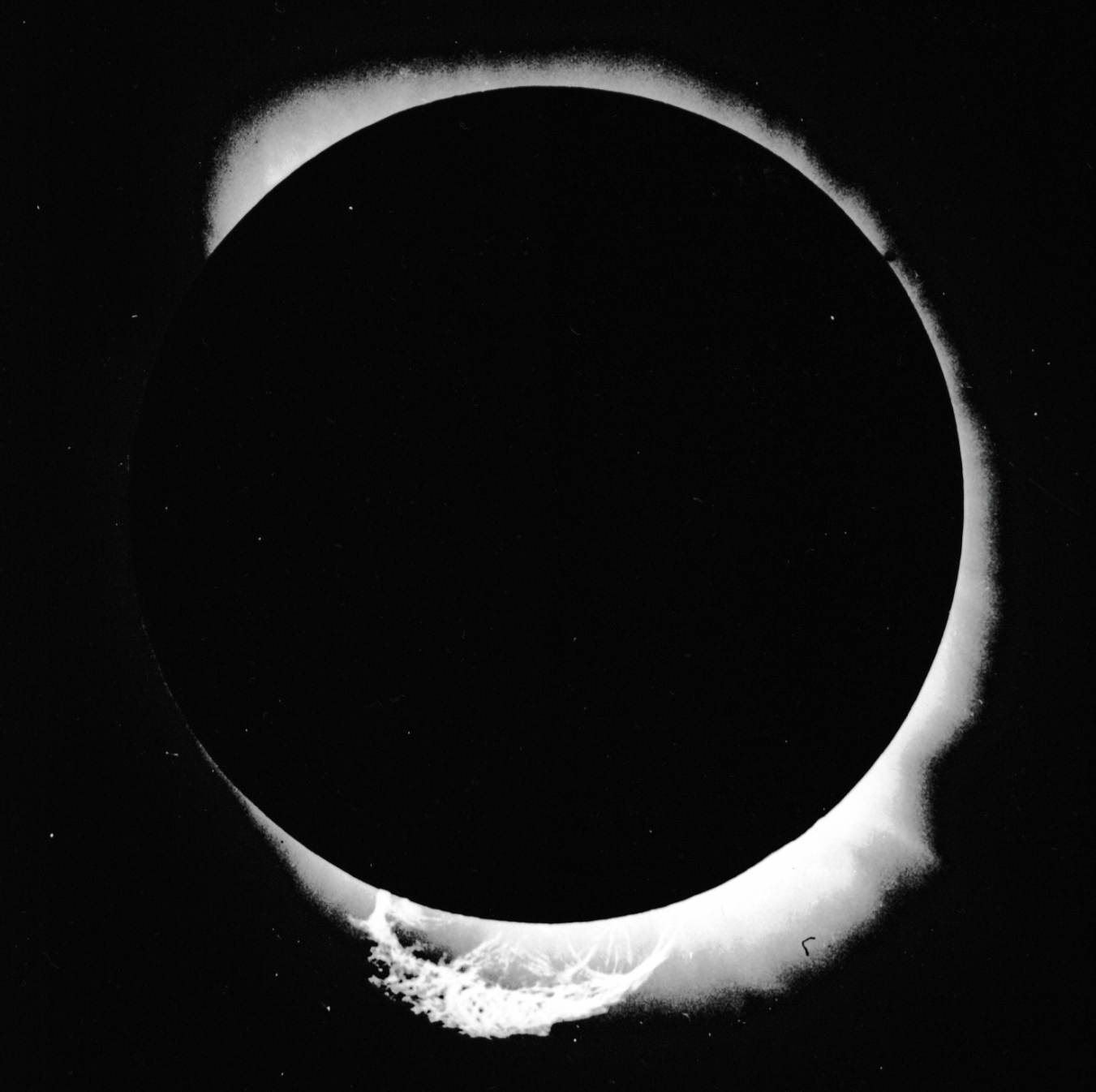 The great prominence visible here is from the famous 1919 eclipse. The photo was taken by Arthur Stanley Eddington using an Astrographic lens on the island of Principe. This image was worthless for testing Einstein’s light deflection effect. Clouds occluded the stars near the Sun but prevented overexposure of the bright prominence. (Courtesy of Charlie Johnson.)