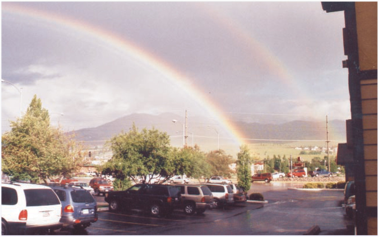 have done well in explaining the rainbow in terms of geometric optics. The phenomenon of the double rainbow is shown to be one collective optical pattern not always seen or recognized as such. In particular, knowledgeable observers have aptly described the dark zone between the primary and the secondary rainbows as an optical interferometric condition. The effect of the interference is clearly visible in the photograph. However, the destructive interference in the dark zone is not complete; witness the mountain image in the background.