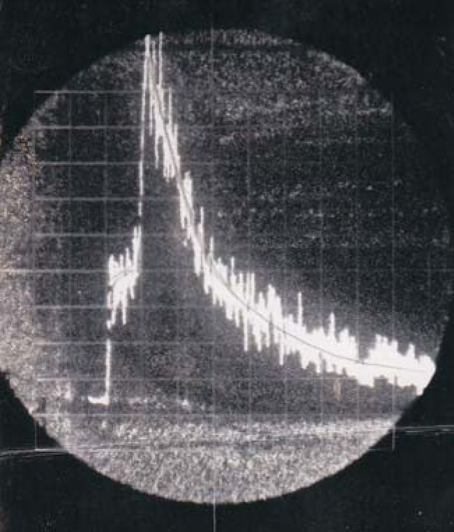 Oscilloscope trace of ruby laser pulse power versus time, recorded by Theodore Maiman in May 1960.