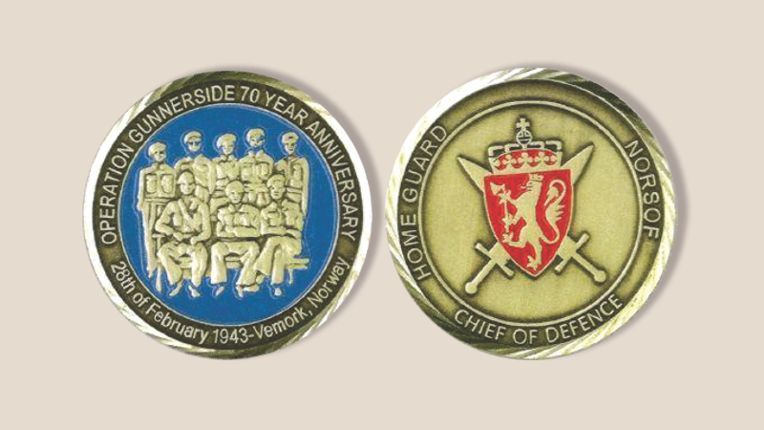 Commemorative medal issued by the Norwegian Home Guard’s Chief of Defense for the 70th anniversary of the successful Operation Gunnerside raid on the Norsk Hydro heavy-water facility, 27–28 February 2013. Medal maker: Per Hauge.
