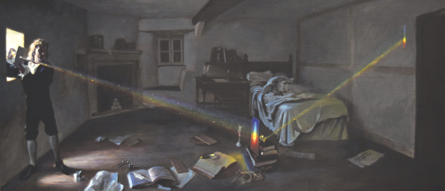Isaac Newton, depicted here experimenting with light, was reclusive and reluctant to publish. Would he have been granted tenure at a modern university? (Acrylic painting by Sascha Grusche, 17 December 2015, CC BY-SA 4.0