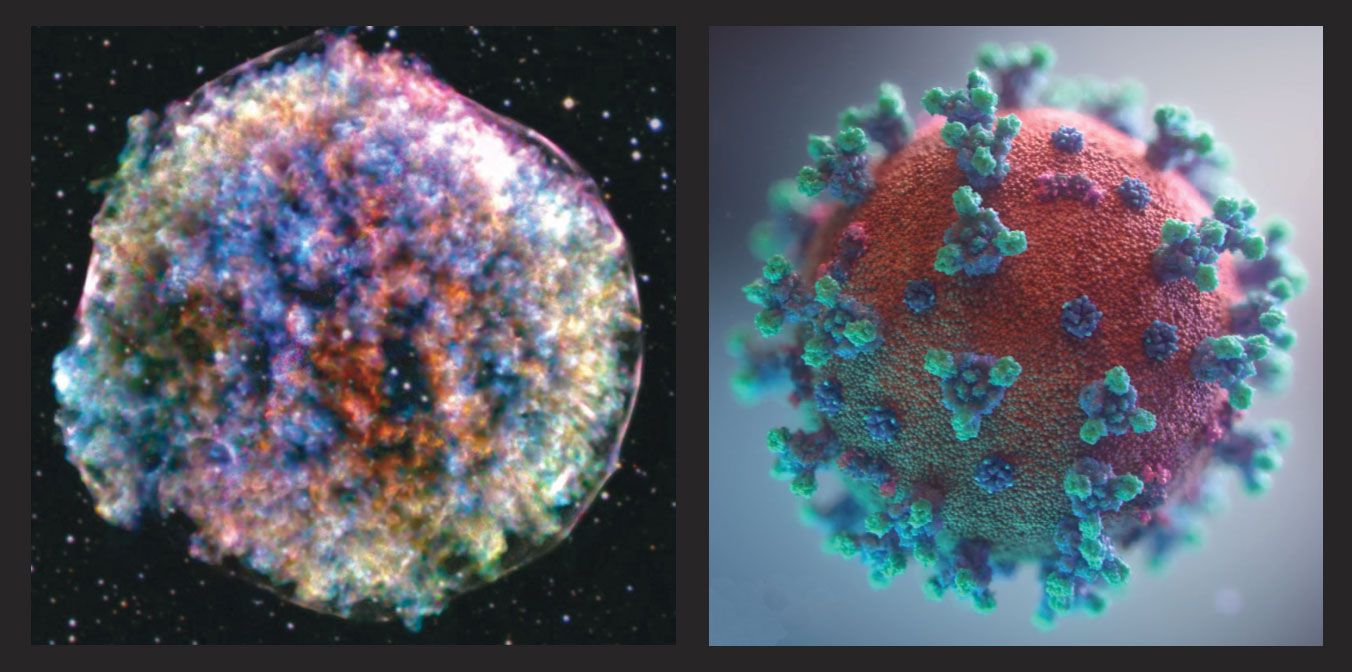 Tycho’s supernova (left) imaged by the Chandra X-Ray Observatory. (Courtesy of NASA/CXC/RIKEN & GSFC/T. Sato et al.) SARS-CoV-2 virus (right) from a 3D computer simulation. (Courtesy of Fusion Medical Animation.)