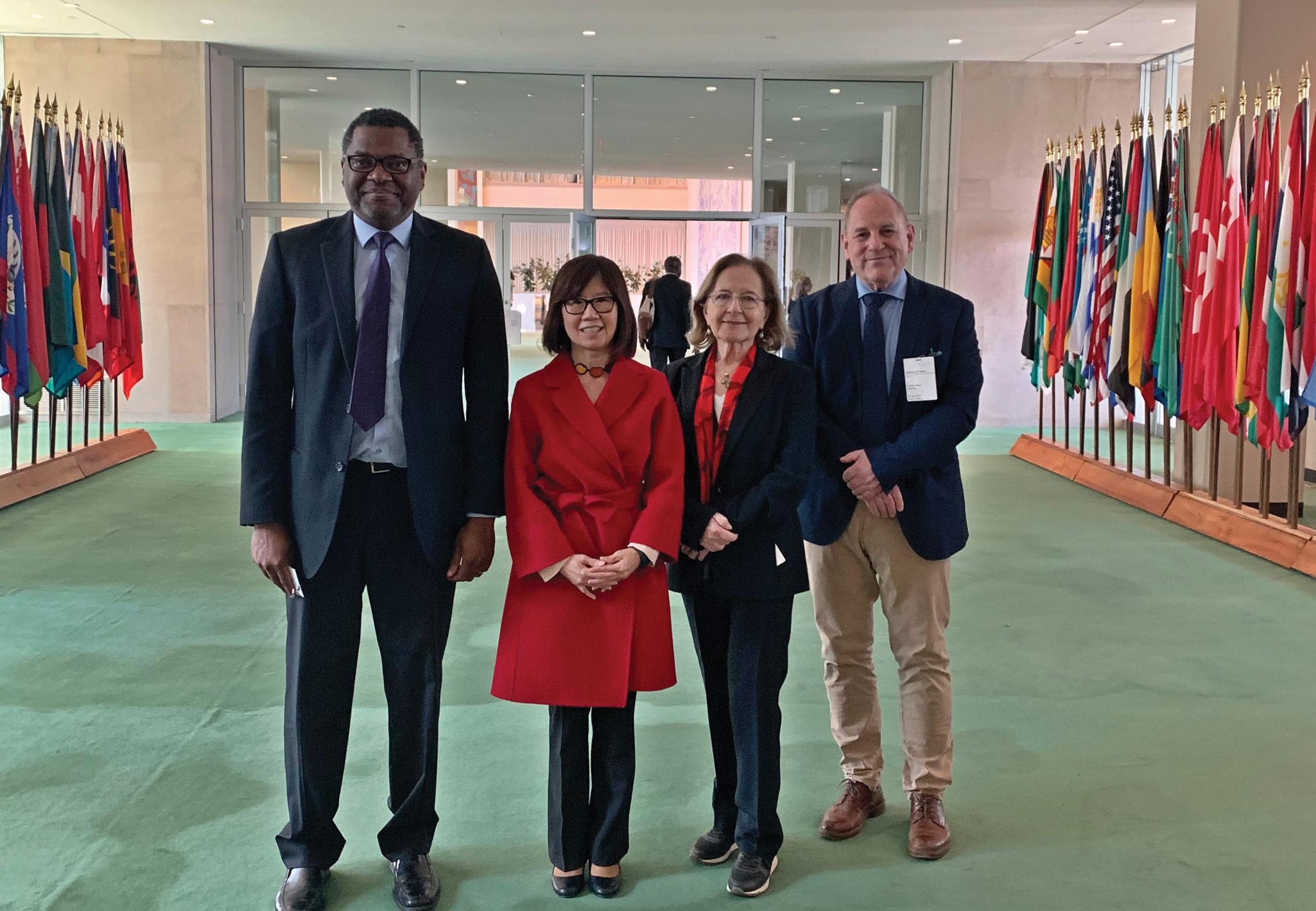 A delegation headed by Joe Niemela (far right), a scientist emeritus at UNESCO and the Abdus Salam International Centre for Theoretical Physics, rallied support for the IYQ at the United Nations last April. The other delegates were, from left, Yanne Chembo (University of Maryland), American Physical Society president Young-Kee Kim (University of Chicago), and Ana María Cetto (National Autonomous University of Mexico). (Photo courtesy of Joe Niemela.)