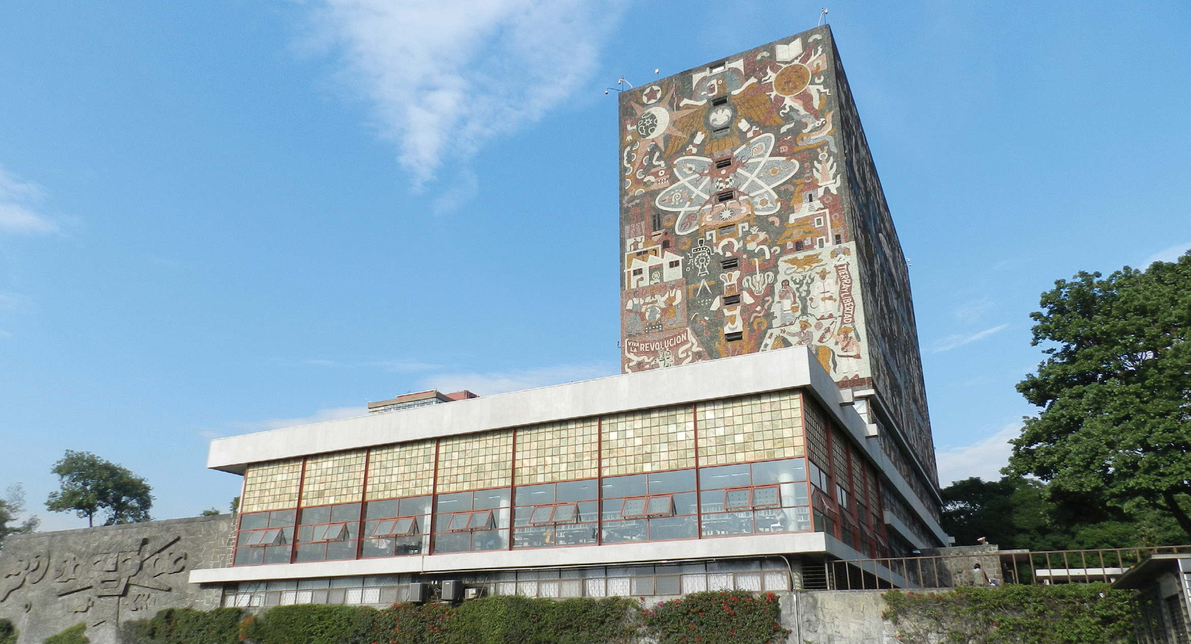 This mosaic from the 1950s at the National Autonomous University of Mexico explores the past and present. The eastern wall (shown) portrays the contemporary world, with the atom taking center stage. (Photo by Miguel Zorrilla, General Directorate of Libraries and Digital Information Services, National Autonomous University of Mexico.)