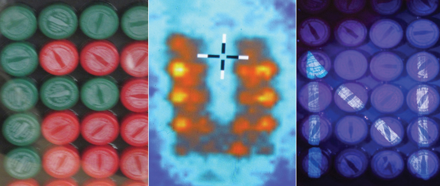 This bottle cap mosaic reveals different symbols when it’s exposed to different wavelengths of light. Players in the escape room LabEscape progress by solving quantum puzzles like this one. (Photo courtesy of Paul Kwiat.)