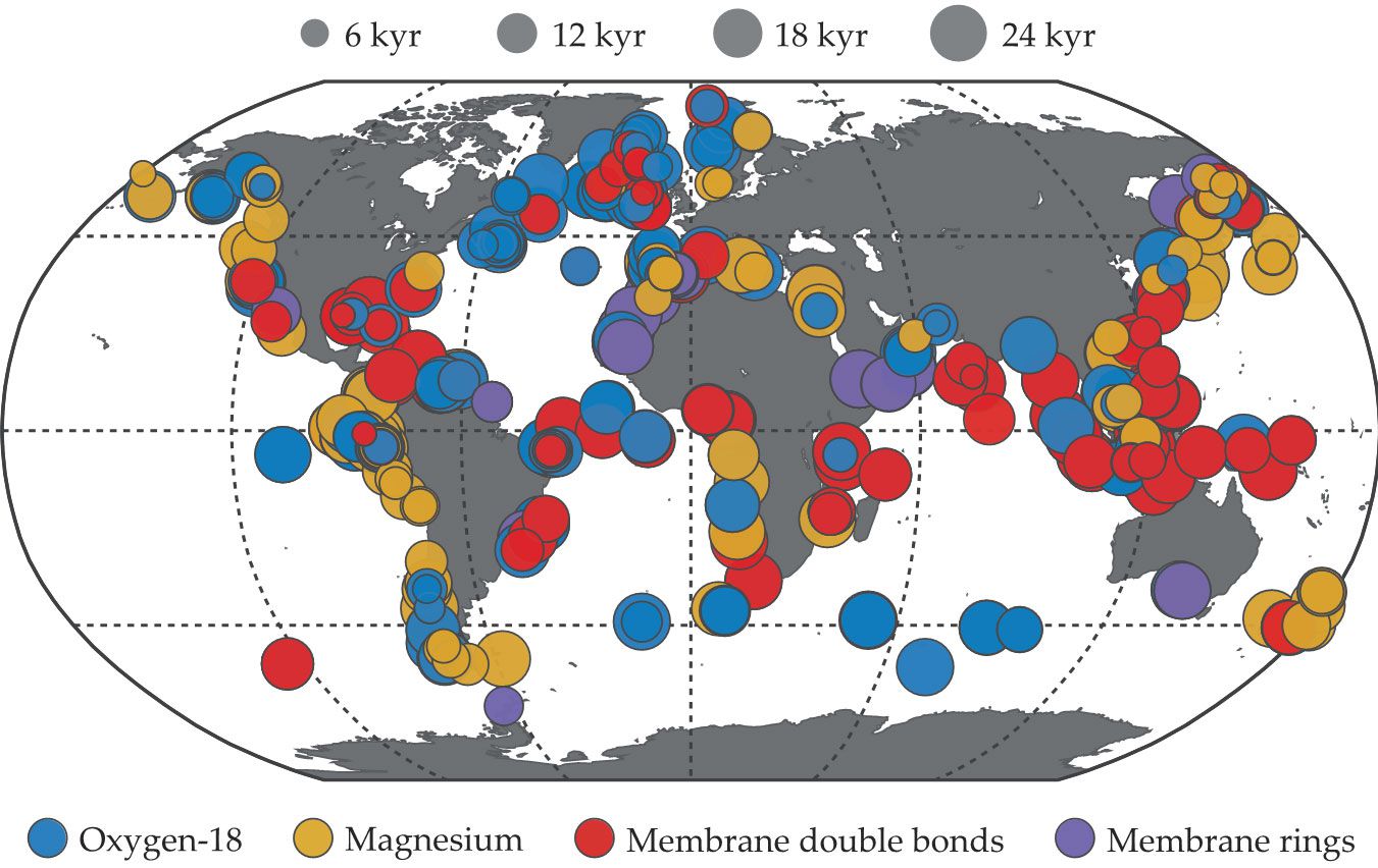 Ocean plankton preserved in seafloor sediments provide some of the best records of Earth’s past temperature. Shown here are the locations of plankton sampling sites. The circle colors represent the type of geochemical data, and the sizes represent the duration of each temperature record in kiloyears (kyr). Relative to the rest of the world, the Southern Ocean—an important but inaccessible region—is poorly sampled. (Adapted from ref.