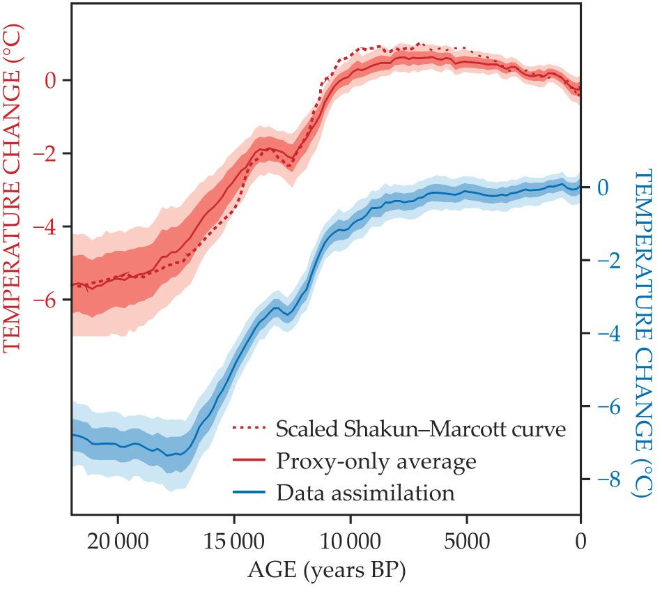The data assimilation also sheds new light on the so-called Holocene temperature conundrum, the puzzle of how Earth’s temperature has changed over the past 7000 years. Previous temperature reconstructions, including the red dotted line