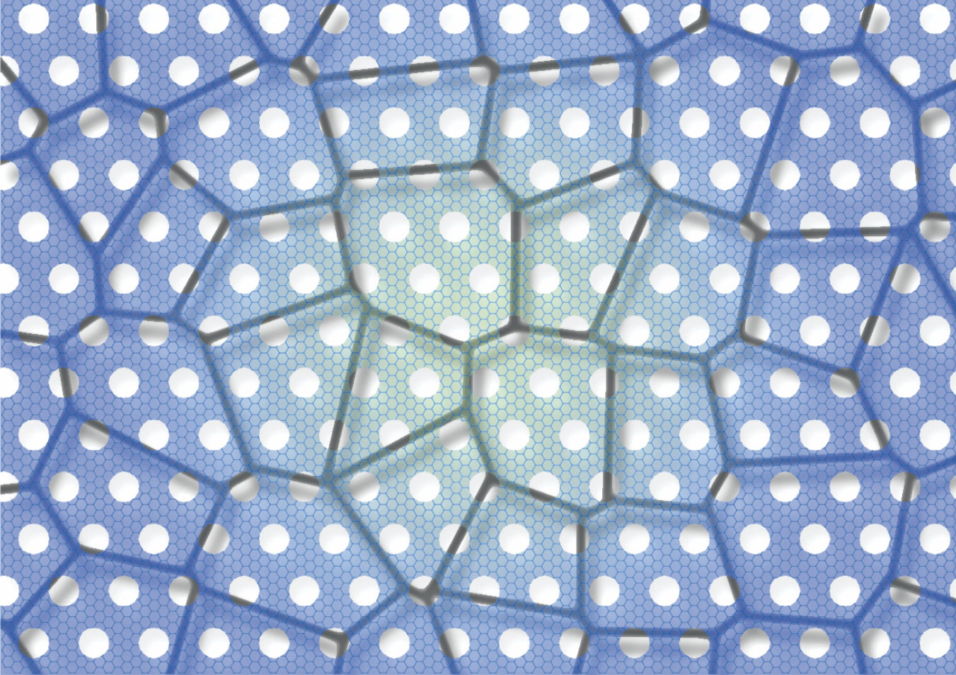 Nanoporous single-layer graphene is reinforced by a network of carbon nanotubes. The nanotubes create microscale sections, represented by the outlined polygons, that ensure the membrane’s structural integrity. (Adapted from ref.