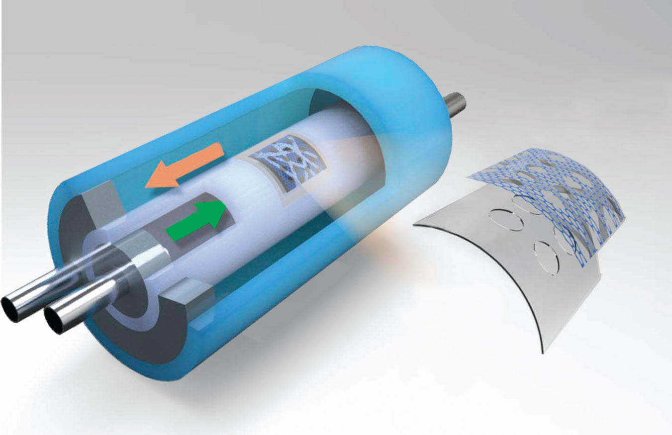 In a tubular desalination module, the nanoporous graphene membrane is fixed to a curved porous polymer substrate that is integrated into the innermost of two silicone tubes. Saline water (orange arrow) feeds into the aperture between the tubes and creates pressure on the membrane. Desalinated water (green arrow) is drawn out from the inner tube. (Adapted from ref.