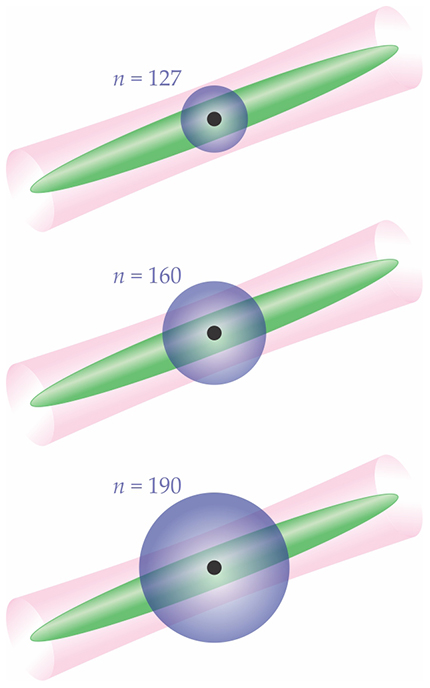 A Rydberg atom is one in which the outermost electron roams far from the nucleus in a highly excited, loosely bound orbit. Pfau’s group has spent years perfecting techniques for creating them. These days the researchers routinely create giant Rydberg atoms with principal quantum number n approaching 200. That corresponds to an orbital radius of several micrometers, roughly 10 000 times larger than normal.