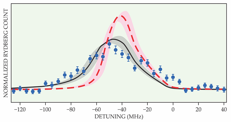 An ionic signature. Spectral data show the likelihood of a Rydberg transition—to a state with quantum number n equal to 160—in a Bose–Einstein condensate (BEC) of rubidium-87 as a function of the detuning of the excitation beam. The observed redshift and line broadening can’t be fully explained by treating the Rydberg atom as an electron (red). A model (black) that treats BEC–Rydberg interactions as atom–ion interactions yields a better fit. The shaded areas indicate 10% uncertainty. (Adapted from ref.