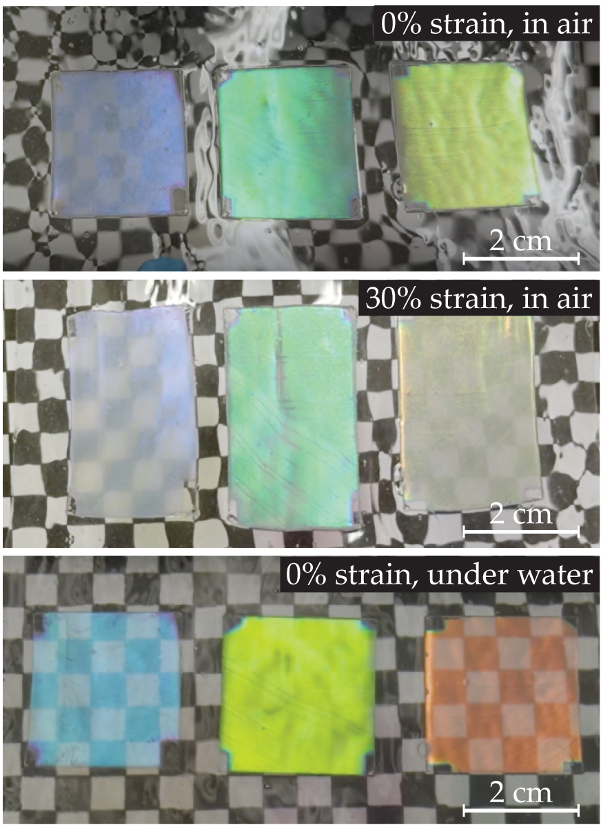 The researchers used vapor deposition to build nanocolumns of metal oxides and varied the deposition angle to produce the targeted sinusoidal refractive index profile. The nanocolumns were then attached to a polymer to provide flexibility. The result was a material that changes color depending on what angle it is viewed from, how much it is stretched, and what fluid it is submerged in, as shown in figure