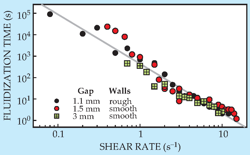 Manneville and colleagues repeated the experiment, rotating the cylinder at different speeds. Not surprisingly, fluidization happened faster when the cylinder was spun faster. But quantitatively, the dependence took an unexpected form: The fluidization time was inversely proportional to the cylinder’s speed raised to the 2.3 power. When the researchers looked at thicker layers of gel, they found a power-law dependence on the shear rate (the inner wall’s linear speed divided by the gap width), as shown in figure 2. And it mattered little whether the inner and outer walls were bare plexiglass or whether they were coated with sandpaper to make them rough.