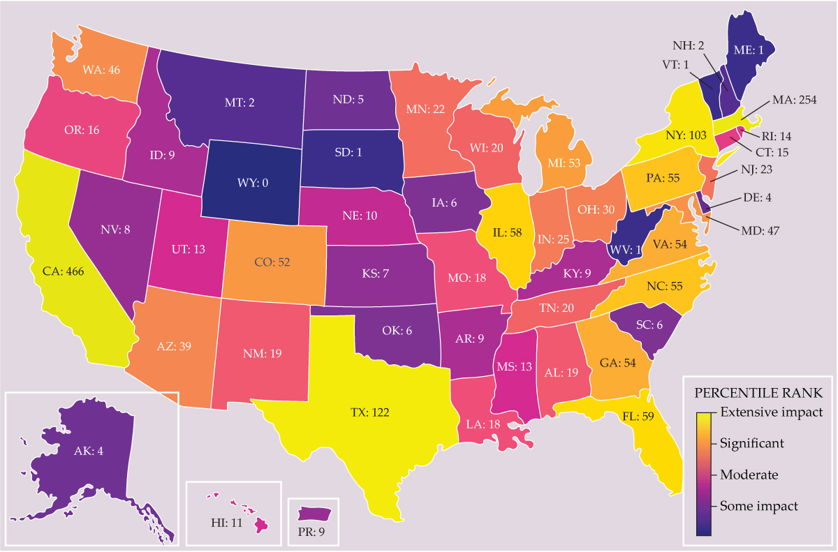 A map of NSF grant impacts by state, created from Grant Witness data, reveals the hot spots nationwide as of 29 August. The numbers and colors indicate the total number of grants impacted, including canceled and possibly reinstated grants. (Image courtesy of Grant Witness.)