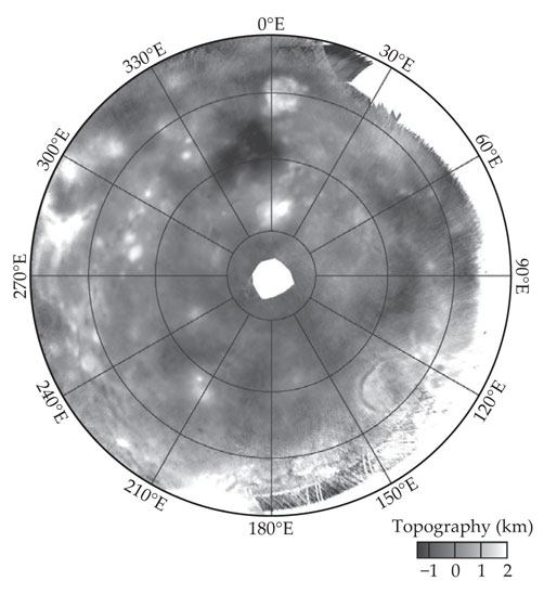 A day on Venus just got longer. For two years in the early 1990s, the Magellan spacecraft bounced radar waves off the surface of Venus. Echo return times gave surface topo-graphy, and tracking the radar images yielded a planetary rotation period of 243.0185 Earth days. Our nearest-neighbor planet was visited again in 2006, this time by the European Space Agency’s Venus Express. The new mission also created a topographic map, but did so by measuring thermal radiation emitted from the surface. Because the Venusian atmosphere is so thick with greenhouse gases, temperature fluctuations in its lower regions are minimal and temperature serves as an indicator of altitude. When Nils Mueller (German Aerospace Center) and colleagues compared their map (see the figure) with Magellan’s, they were surprised to see a subtle longitudinal offset. Subsequent analysis revealed that in order to align the maps, the rotation period of Venus must be 6.5 minutes longer than determined by Magellan—at least when averaged over the 16 years separating the Express and Magellan observations. The new result actually agrees with Earth-based radar measurements made before Magellan, and Mueller and colleagues note that the Magellan data were obtained over a relatively short time. They suggest that Magellan might have measured an anomalous rotation rate. It’s not implausible that Venus could be temporarily torqued; interactions with its atmosphere, the Sun, or Earth could each do the job. (N. T. Mueller et al., Icarus 217, 474, 2012.)