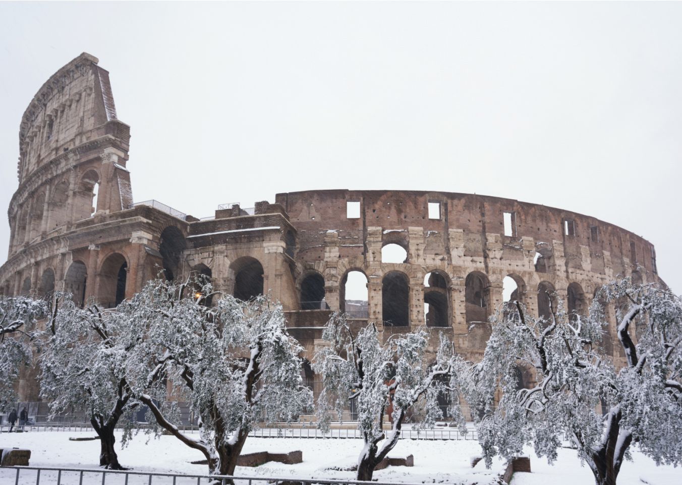 Figure 1. Snow fell in Rome, for only the second time in 35 years, during a 2018 event that brought extreme winter weather to much of Europe. A new analysis attributes that snowfall to the winter retreat of Arctic sea ice. (Image from iStock.com/ROMAOSLO.) Figure 2. The Arctic Ocean is predominantly covered by ice (light gray) in the winter. But an increasingly frequent exception is the Barents Sea, one of the only swaths of water north of the Arctic Circle to have been free of ice in March 2018. The open water supplied the atmospheric moisture that fell as snow in Europe in that year between 19 February and 28 March. The black square marks the site of the weather station in northern Finland where isotopic analysis pinpointed the source of the snow. (Adapted from ref.
