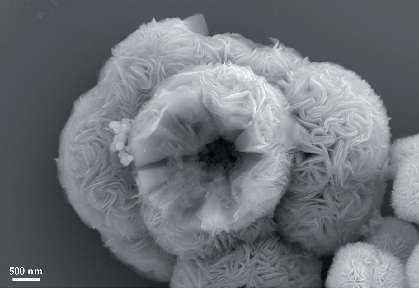 Layers of the material Ti2CCl2, synthesized through a new chemical vapor deposition reaction, form hierarchically structured, flowerlike spheres. Directly synthesizing Ti2CCl2 and other MXenes from their constituent elements could pave the way for a broader campaign of basic research on the two-dimensional conductive materials. (Courtesy of Di Wang.)