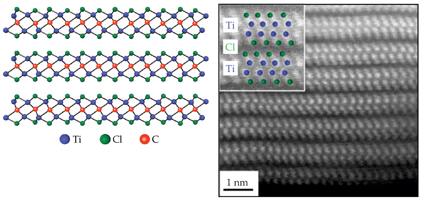 Atomic structure of a MXene. On the left is a ball-and-stick diagram of three layers of Ti2CCl2. On the right is an electron micrograph of the same structure showing the positions of the titanium and chlorine atoms. (Adapted from ref.