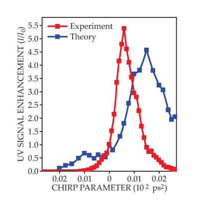 Figure 1, in which the chirp is positive, illustrates one of many possible sequences of Raman transitions. The reduction in the molecules’ vibrational energies stabilizes their bonds and leads to an increase in the UV emission signal. The energy-lowering process is limited by the intensity and bandwidth of the laser, though, and the signal eventually drops when the chirp of the pulse becomes too high. The drop is mainly due to the significantly reduced maximum light intensities associated with larger chirps, which stretch out the pulse duration to as much as several hundred femtoseconds.
