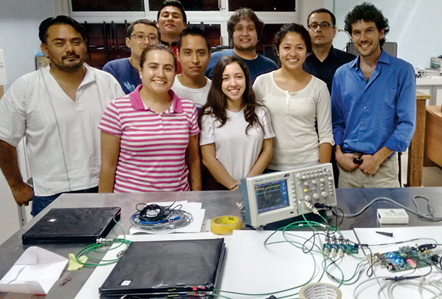 Escaramujo Project leader Federico Izraelevitch (right) poses with students from the Autonomous University of Chiapas in Mexico. The circuit board on the desk is a cosmic-ray detector made at Fermilab.