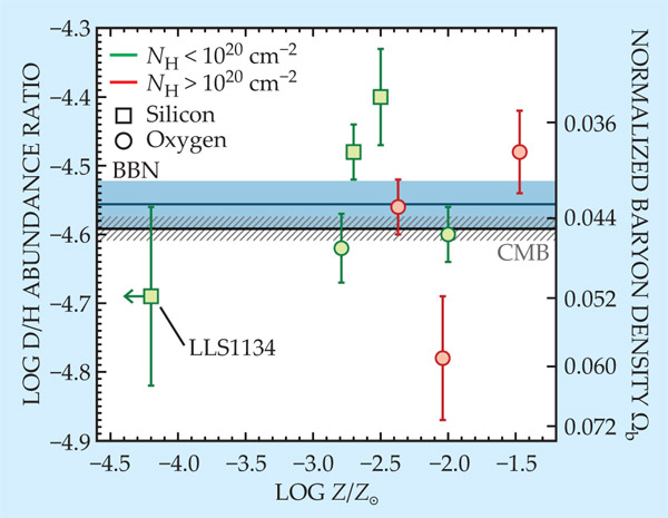 Figure 2. The primordial deuterium/hydrogen abundance ratio predicted from cosmic-microwave-background (CMB) data (hatched bar) is compared with direct measurements in a variety of high-redshift clouds, plotted as a function of their metallicities Z. The new LLS1134 datum has only an upper limit on Z. The right-hand axis translates D/H into cosmic baryon density according to Big Bang nucleosynthesis (BBN) theory, and the blue bar shows the new world average of D/H measurements. The measurements are consistent with the CMB baryon-density determination and with each other. There’s no evident dependence of measured D/H on a cloud’s hydrogen column density NH, its Z, or the heavy element on which the Z measurement is primarily based. (Adapted from ref.