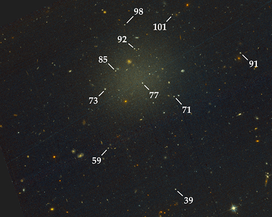 The figure shows a Hubble Space Telescope image of the faint galaxy; the 10 labels indicate star clusters on the outskirts. From Doppler-shift measurements of each cluster’s absorption spectrum, the researchers could obtain the speed at which the cluster orbits the galaxy.