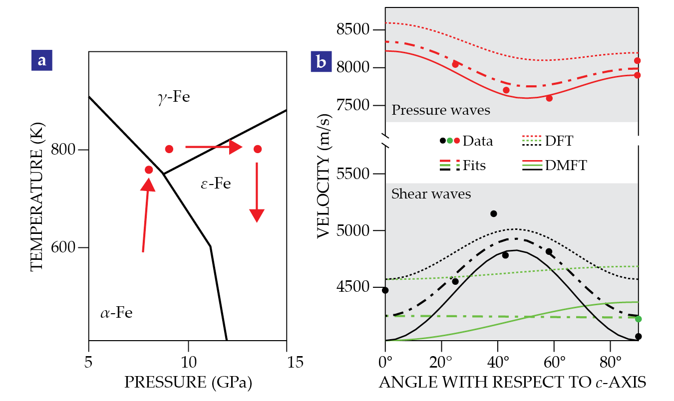 Single crystals of ε-Fe, the form of iron thought to exist in Earth’s inner core, can’t be made by directly squeezing the ambient-pressure phase α-Fe. (a) But they can be made by taking a detour through the high-pressure phase γ-Fe, as shown in the path in red. (b) Sound-speed measurements on ε-Fe single crystals clearly show the material’s elastic anisotropy, and they provide a valuable benchmark for theoretical models such as density functional theory (DFT) and dynamical mean field theory (DMFT). (Adapted from ref.