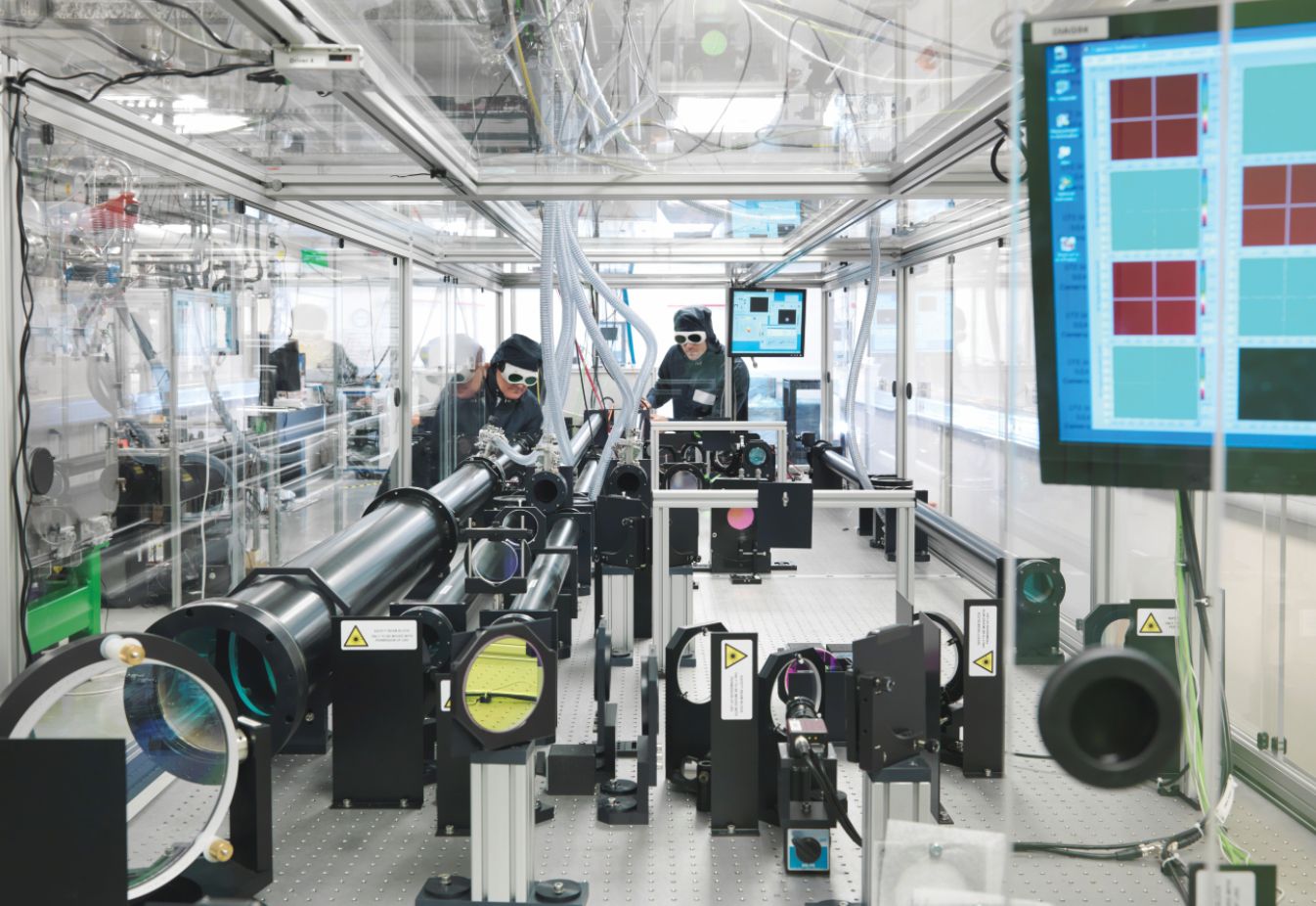 The Gemini laser at the Central Laser Facility, part of the UK’s Rutherford Appleton Laboratory, provided pulses for a recent experiment on laser-driven ion acceleration. Here researchers check the alignment before they send the laser beam to the target chamber. The shape of the pulses’ temporal profiles resulted in the preferential acceleration of carbon ions over proton contaminants that usually dominate ion beams. The short, high-flux burst of carbon ions could be useful for research into more efficient radiotherapy treatments. (Courtesy of the Central Laser Facility, STFC.)