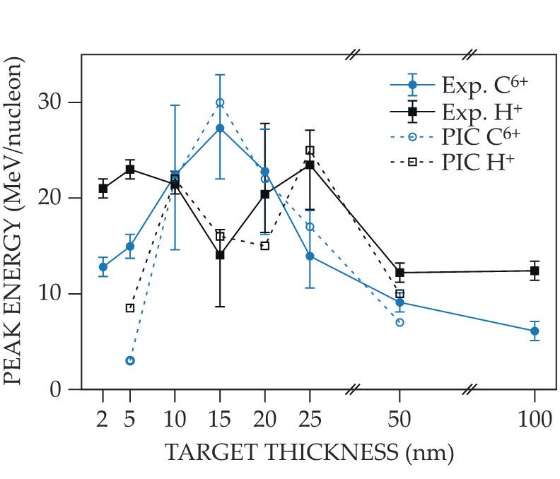 In the new study, McIlvenny measured the maximum energy of the ejected carbon ions as a function of target thickness and found that the peak occurred in a 15-nm-thick target, as shown by the solid blue line in figure