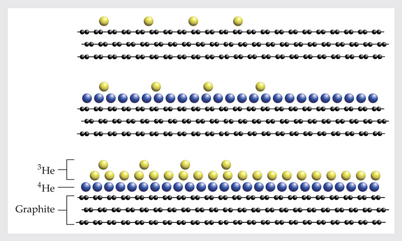 Figure 1. Mimicking two dimensions. When chilled to millikelvin temperatures, helium-3 atoms atop a graphite substrate (top), a dense 4He monolayer (center), or dense 4He and 3He monolayers (bottom) closely approximate a 2D quantum fluid. In the multilayer films, the bottom monolayer of 4He serves to mitigate the effects of heterogeneities in the graphite substrate. (Adapted from ref.