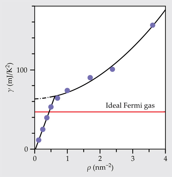 Figure 2. Calorimetric data for ultracold helium-3 atop a dense 4He monolayer show signatures of a liquid phase: At low coverage densities, γ—the slope of the heat capacity as a function of temperature—grows linearly with the average coverage density ρ. In that regime, 3He collects into liquid puddles of fixed, low density. Above the critical density of ρ ≈ 0.6 nm−2, at which the puddles presumably cover the entire substrate surface area, γ grows nonlinearly, indicating strengthening atomic interactions. Extrapolated to ρ = 0 (dot–dash line), the nonlinear branch yields a γ that’s roughly 25% larger than the ideal Fermi gas value, indicated by the red line. (Adapted from ref.
