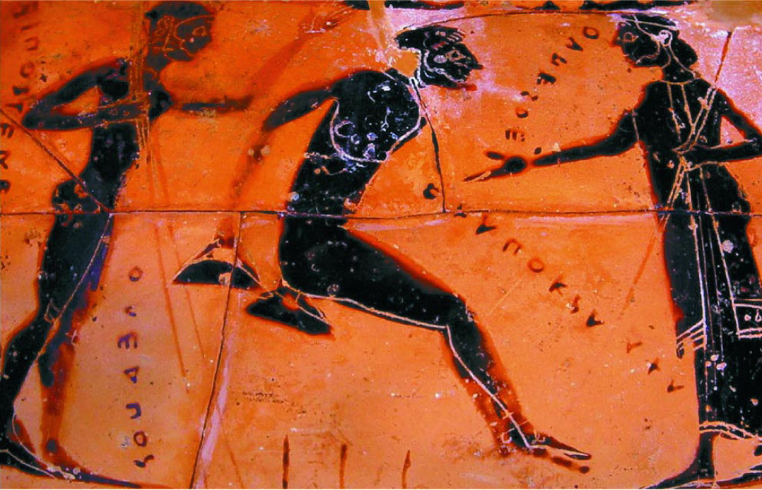 Few details are known about how jumping events in the ancient Olympiads were conducted or judged, according to David Gilman Romano of the University of Pennsylvania’s department of classical studies and Museum of Archaeology and Anthropology. Written testimonies stipulate that the foot had to land “properly,” and that the halteres were an aid to proper landing. But it is not known if there was a penalty for slipping backward, or for allowing the halteres to touch the ground. Some historians have argued that Olympic athletes could throw the halteres backward before landing, further increasing their jump distance. Some vase paintings indicate that ancient Olympic long jumps commenced from a standing position. Others, though, show athletes taking off on one foot. The depictions of one-footed takeoffs and accounts of better than 50-foot jumps suggest to some scholars that athletes got a running start and that the ancient Olympic long jump was akin to the modern triple jump. Given the nearly 1200-year span of the ancient Olympic games, it could be that the long jump was run differently in various Olympiads. The ancient Greeks, unfortunately, did not leave us definitive rulebooks.