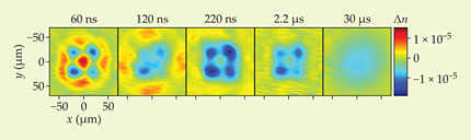 Figure 2. The structured pattern of air density. After a square array of filaments is produced by a femtosecond pulse (t = 0), spikes in air pressure at each lobe launch acoustic waves that constructively interfere in the array’s center, positively shift the air’s refractive index n there, and form a waveguide. After 100 ns or so, the acoustic waves have fled, but they leave behind density depressions in the corners. After a few hundred nanoseconds, the center’s air density remains higher than its surroundings; the depressions slowly fill in by thermal diffusion. (Adapted from ref. 1.)