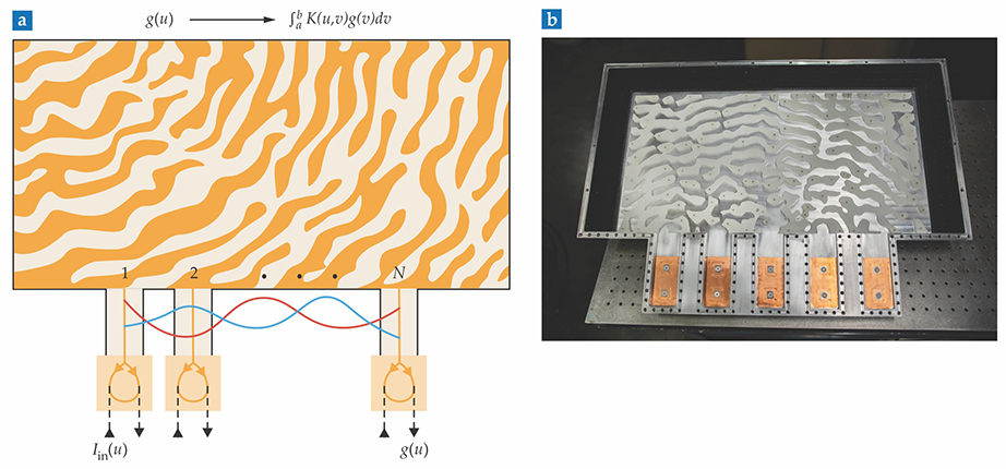 Nader Engheta at the University of Pennsylvania and his collaborators have now built a device that solves integral equations using light. 2 Their metamaterial block repeatedly manipulates a microwave input signal until it reaches a steady state that represents the equation’s solution. Although the device is not yet reconfigurable or programmable, it is smaller than those using other optical processing schemes and has the potential to solve integral equations much faster than a conventional computer.