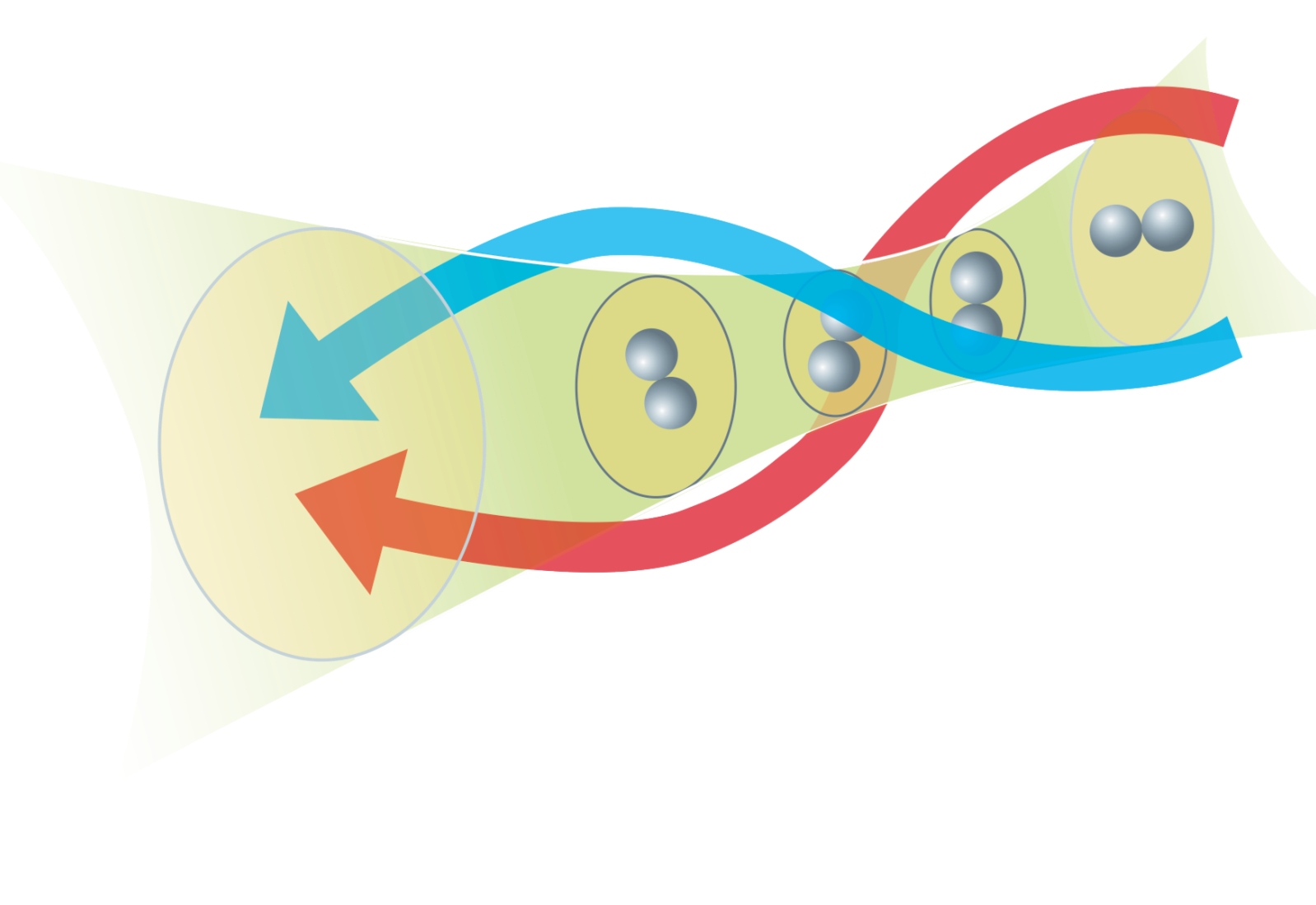 Strontium molecules (gray) held in a one-dimensional lattice of optical traps (yellow) are probed by a pair of Raman lasers (red and blue). Ultraprecise measurements of their vibrational frequencies reflect the fundamental forces acting on the nuclei and electrons.