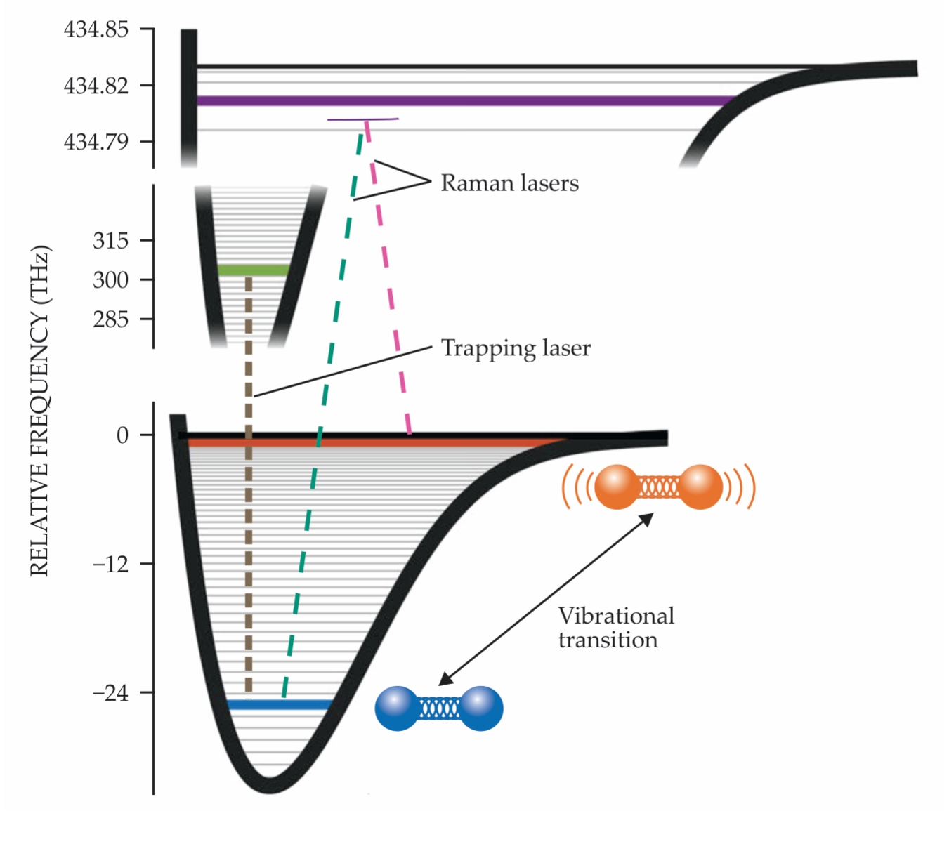 To probe the energy difference between two vibrational states, shown in blue and orange in figure 2, the researchers use Raman spectroscopy, a two-photon process that connects the two states by way of a higher-energy virtual state. The difference between the Raman laser frequencies can be stabilized to better than 0.1 Hz. The technique’s precision is thus limited by molecular, not optical, effects.
