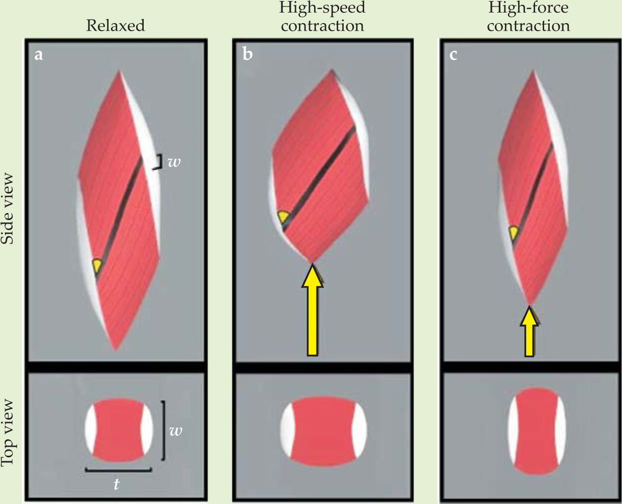 Figure 2. Computer simulations of a contracting pennate muscle. (a) The relaxed-muscle configuration, with the width w, thickness t, and pennation angle (yellow wedge) shown. (b) The contracted-muscle configuration after acting on a small load. The thickness and pennation angle both increase, and the muscle contracts at high speed. (c) The contracted-muscle configuration after acting on a large load. Although the muscle fibers have shortened by the same amount as in panel (b), the length of the muscle itself has changed much less. That allows the muscle to exert a greater force. The simulations are consistent with experiments performed on the calf muscles of wild turkeys.