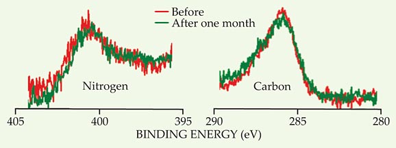 Overall, the NHC in figure 1a proved to be the more stable, perhaps because its lack of bulky side groups allows it to form sturdier and better ordered monolayers. Figure 2 shows the monolayer’s XPS spectra before and after being stored in water at room temperature for one month. It also survived boiling water, the organic solvent tetrahydrofuran, pH 2, and pH 12—each for 24 hours—with no measureable loss of the monolayer. But it wasn’t invincible: A 24-hour exposure to a hydrogen peroxide solution degraded the monolayer by about 20%.