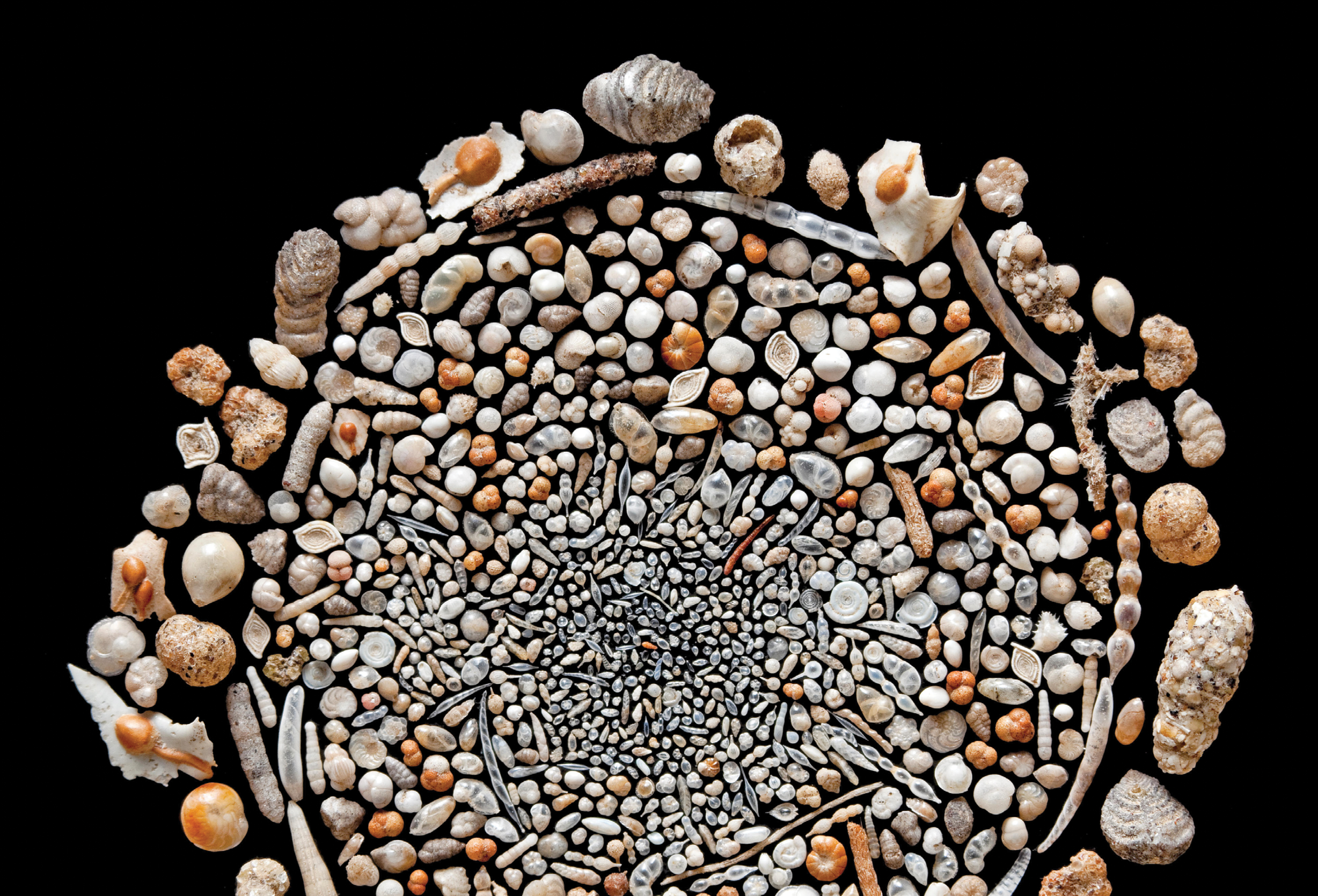 Marine invertebrates, like the many micron-sized species of foraminifera that form the tens of millimeter-sized shells shown here, are useful indicators of changes in ocean temperature and ice volume. (Photo by the Natural History Museum, London/Alamy Stock Photo.)