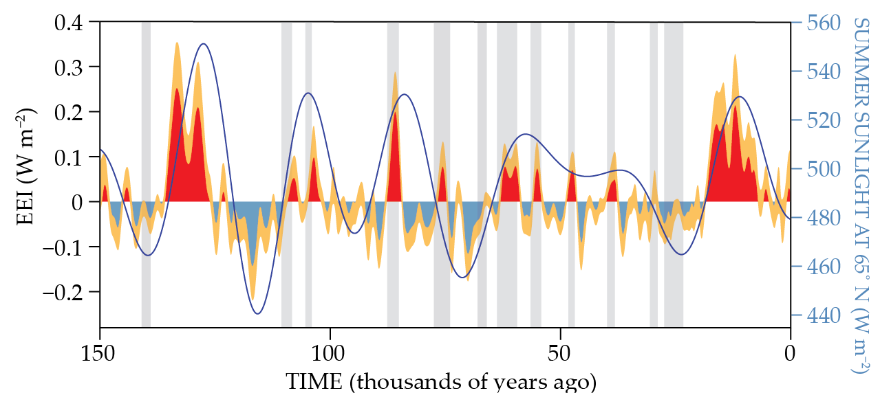 The new record also tracks strongly over time with another well-studied climate variable: the amount of sunlight Earth receives during the summer at 65° N, a bit south of the Arctic Circle. Previous research has linked variations in Earth’s orbit to reductions of sunlight at that latitude and consequently the onset of global-scale ice ages. Increased sunlight there triggers deglaciation. (For more on orbitally driven ice ages, see the article by Mark Maslin, Physics Today, May 2020, page 48