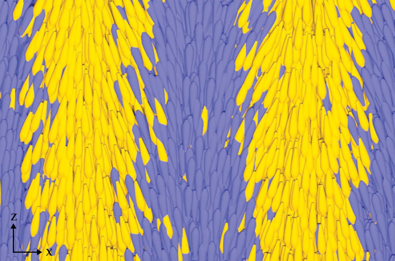 The splay nematic phase in a liquid crystal is made up of polar wedge-shaped molecules. Aligned along the z-axis, the molecules segregate into slightly splayed stripes of molecules with their narrower end pointing toward +z (yellow) and −z (blue). (Adapted from ref.