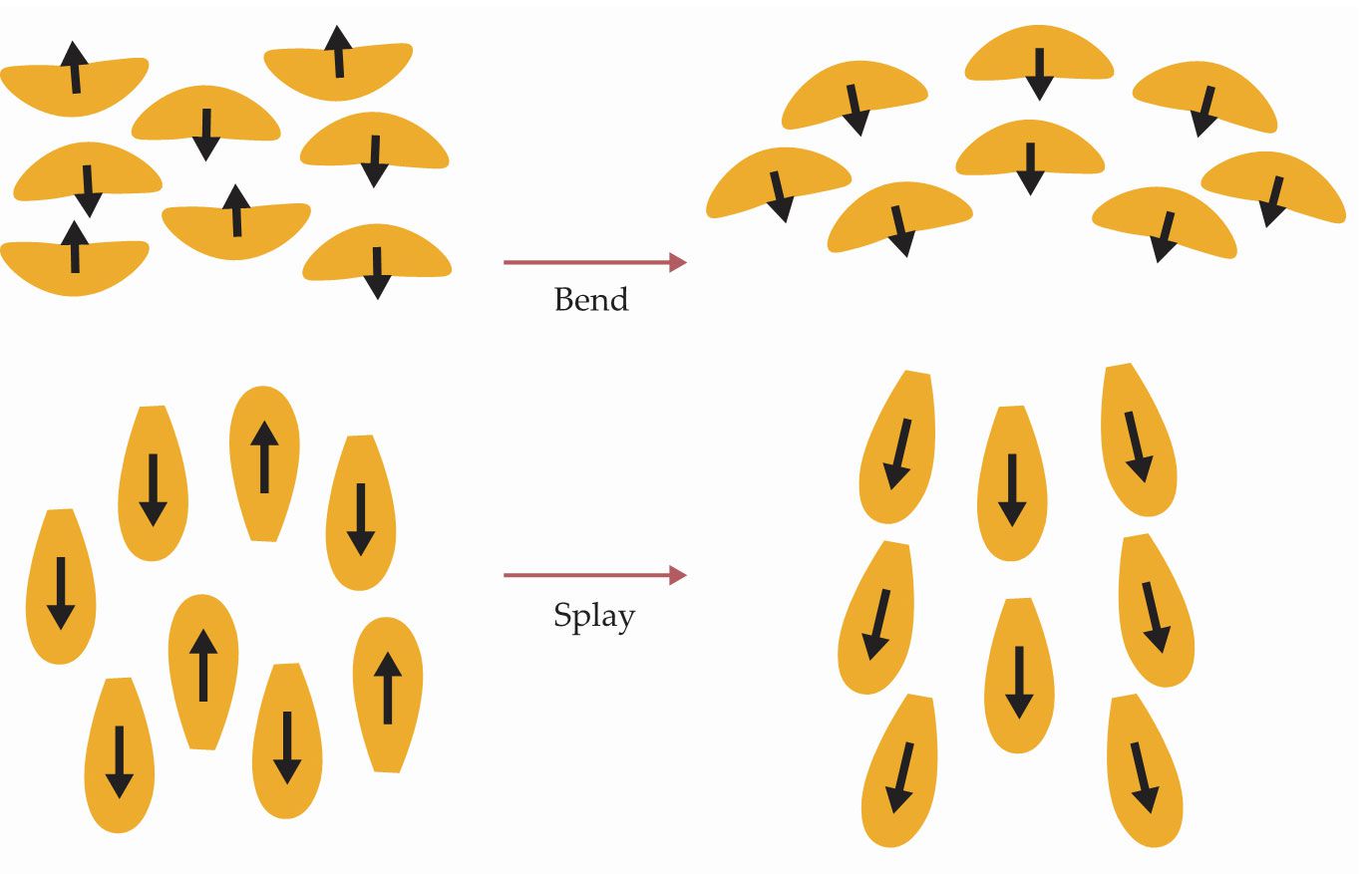 The flexoelectric effect in a nematic liquid crystal describes the coupling between molecular dipoles (black arrows) and strain gradients. Banana-shaped molecules are polarized by an applied bending strain, and wedge-shaped molecules by splay strain. (Courtesy of Nerea Sebastián.)