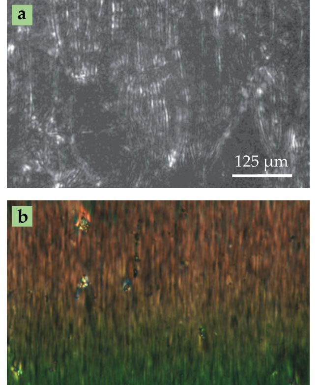 Long molecules with large electric dipole moments, like RM734, don’t usually seek out such parallel, ferroelectric arrangements in the liquid phase. Rather, they energetically prefer to form antiparallel pairs. So as useful as a ferroelectric liquid might be—its spontaneous polarization could enable molecular orientations to be switched quickly and with low power—ferroelectricity in liquid crystals has until now been limited to smectic phases, which, because of their partial positional order, aren’t fully fluid.