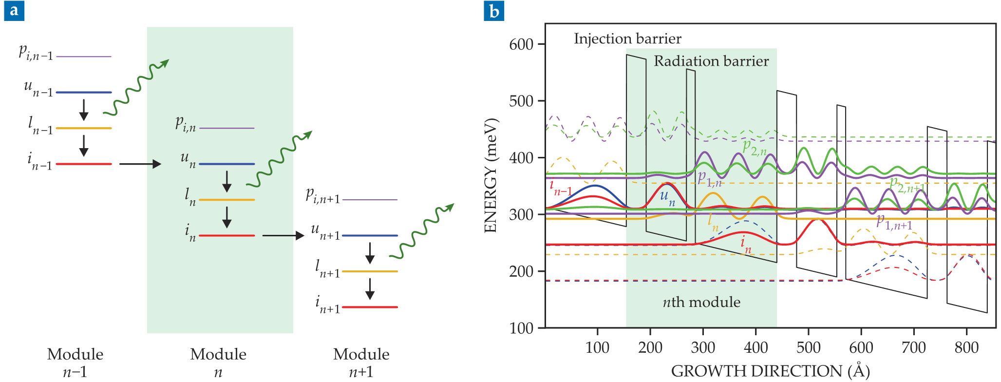 In its simplest form, a QCL works as shown in figure 2a. An electron in the nth set of quantum wells starts in the upper lasing level . When the electron drops down to the lower lasing level , a photon is emitted. The electron then scatters to the ground state, known as the injector level , which is still in the conduction band. An applied electric potential offsets the modules energetically, so the electron tunnels from the injector level into the next module’s upper lasing level, . That cascade effect is responsible for the high power in QCLs.